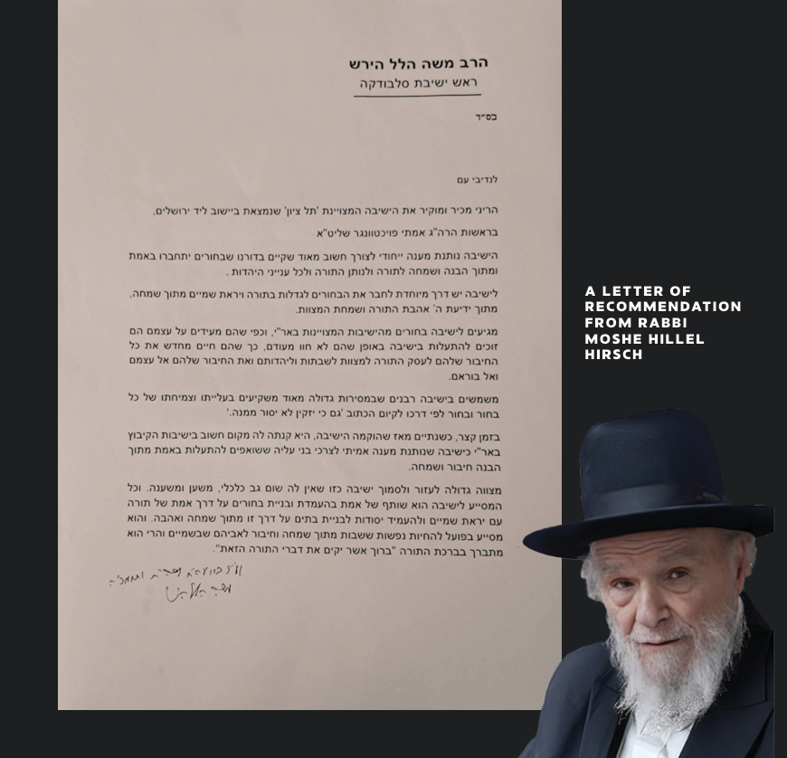 I recognize and deeply appreciate the exceptional yeshiva "Tel Tzion", located in a settlement near Jerusalem, under the leadership of the esteemed Rabbi Amitei, Shlit"a.
